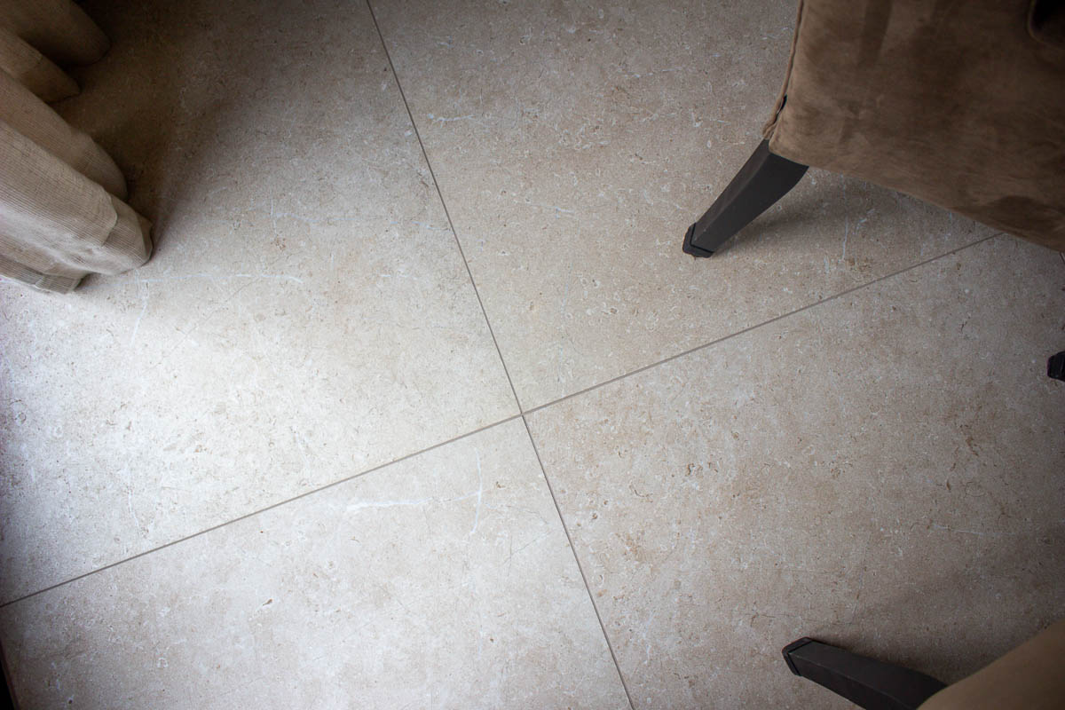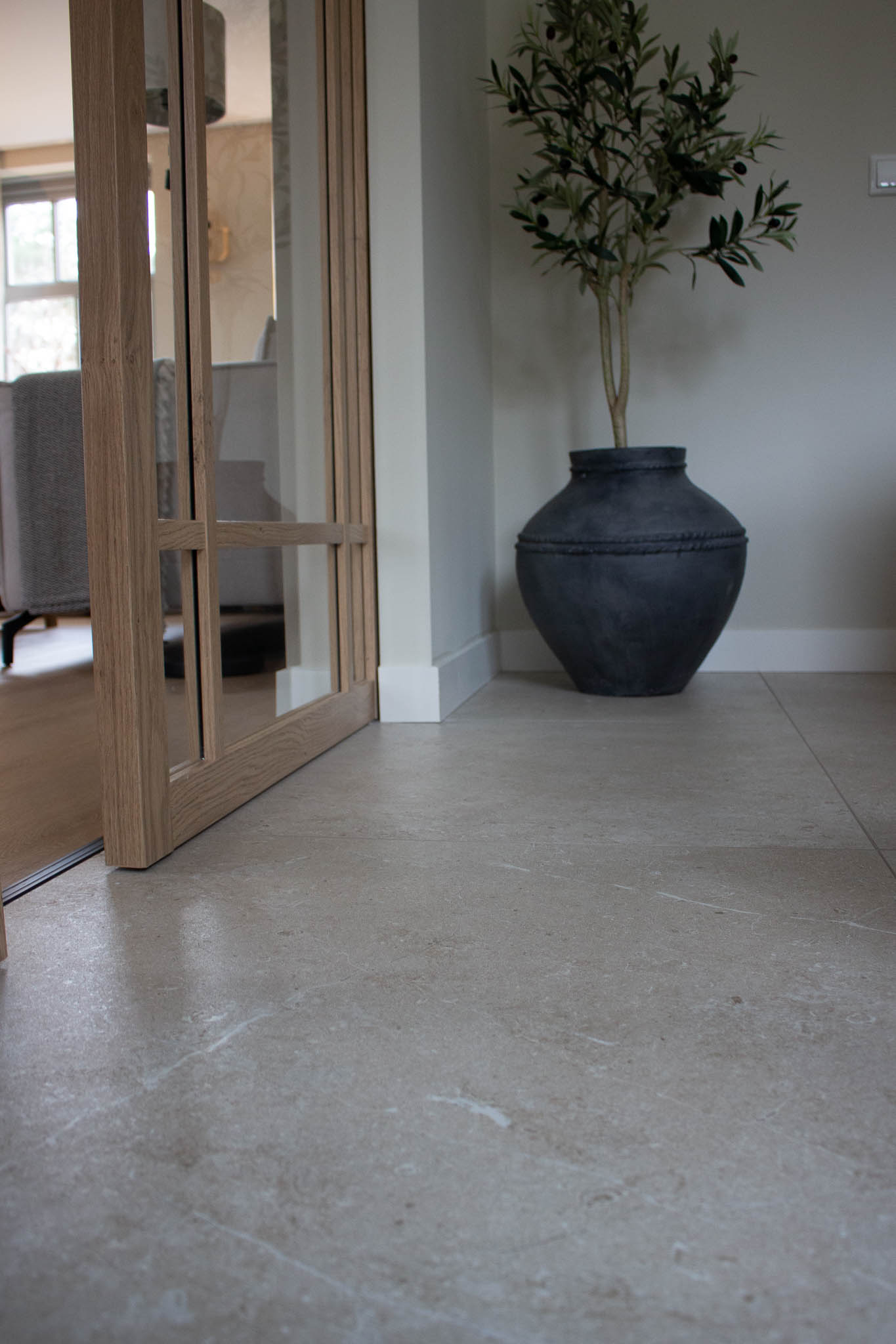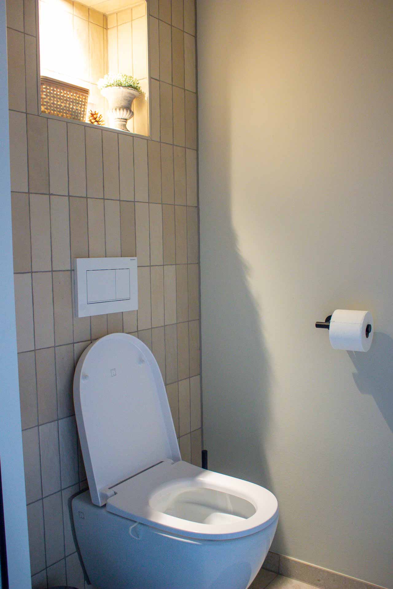 Harmonieuze overgang tussen leefruimtes en sanitair door tegelwerk.